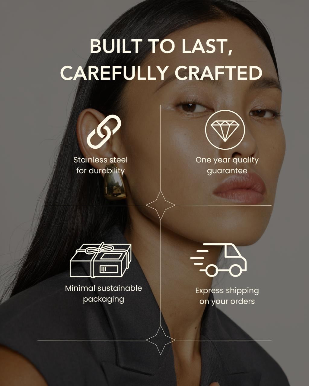 Our jewelry is made from high-quality stainless steel, sterling silver, and 18K gold plating, ensuring durability and elegance.