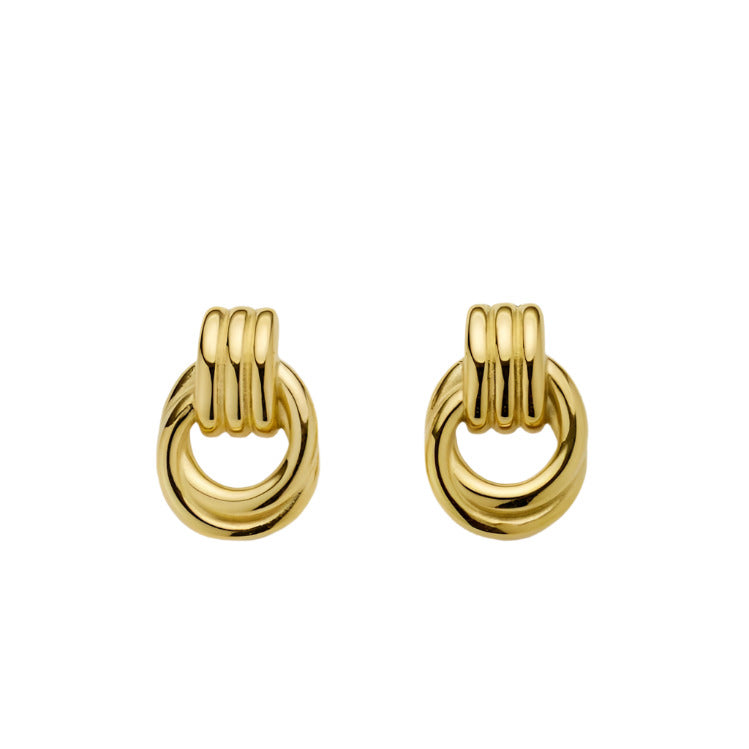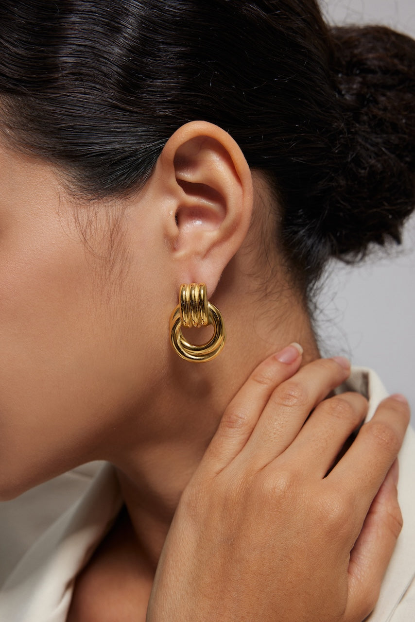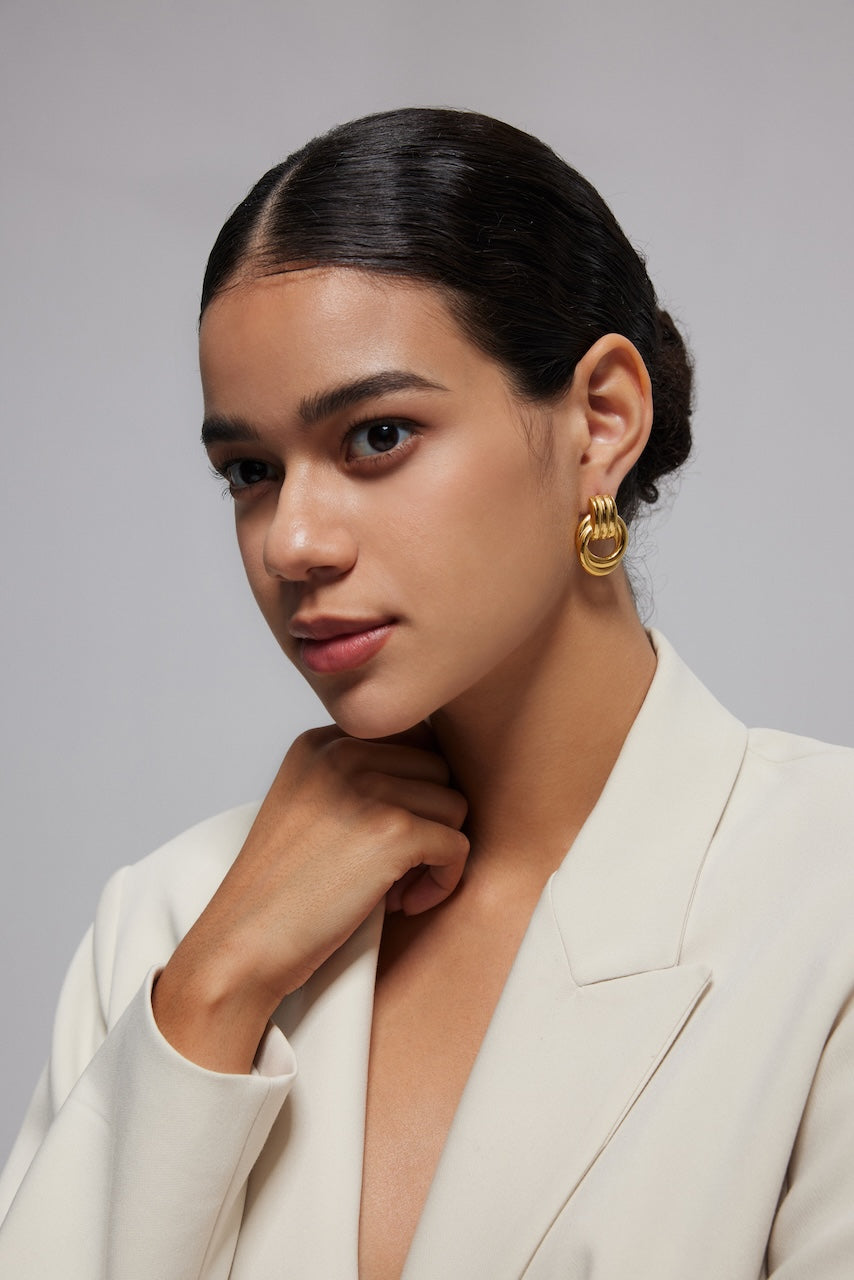 These bold gold earrings feature a unique, intertwined design that adds a modern twist. Their statement shape makes them perfect for elevating any outfit.