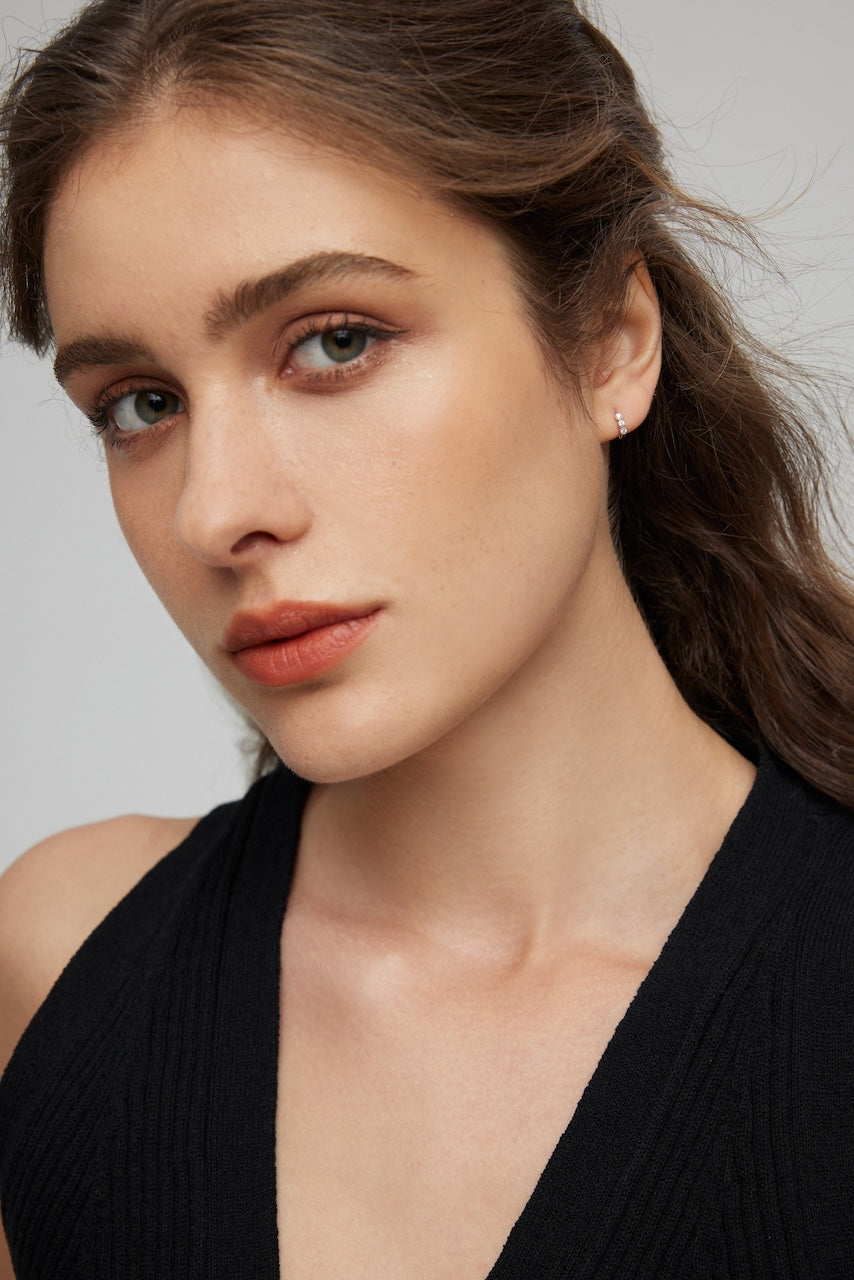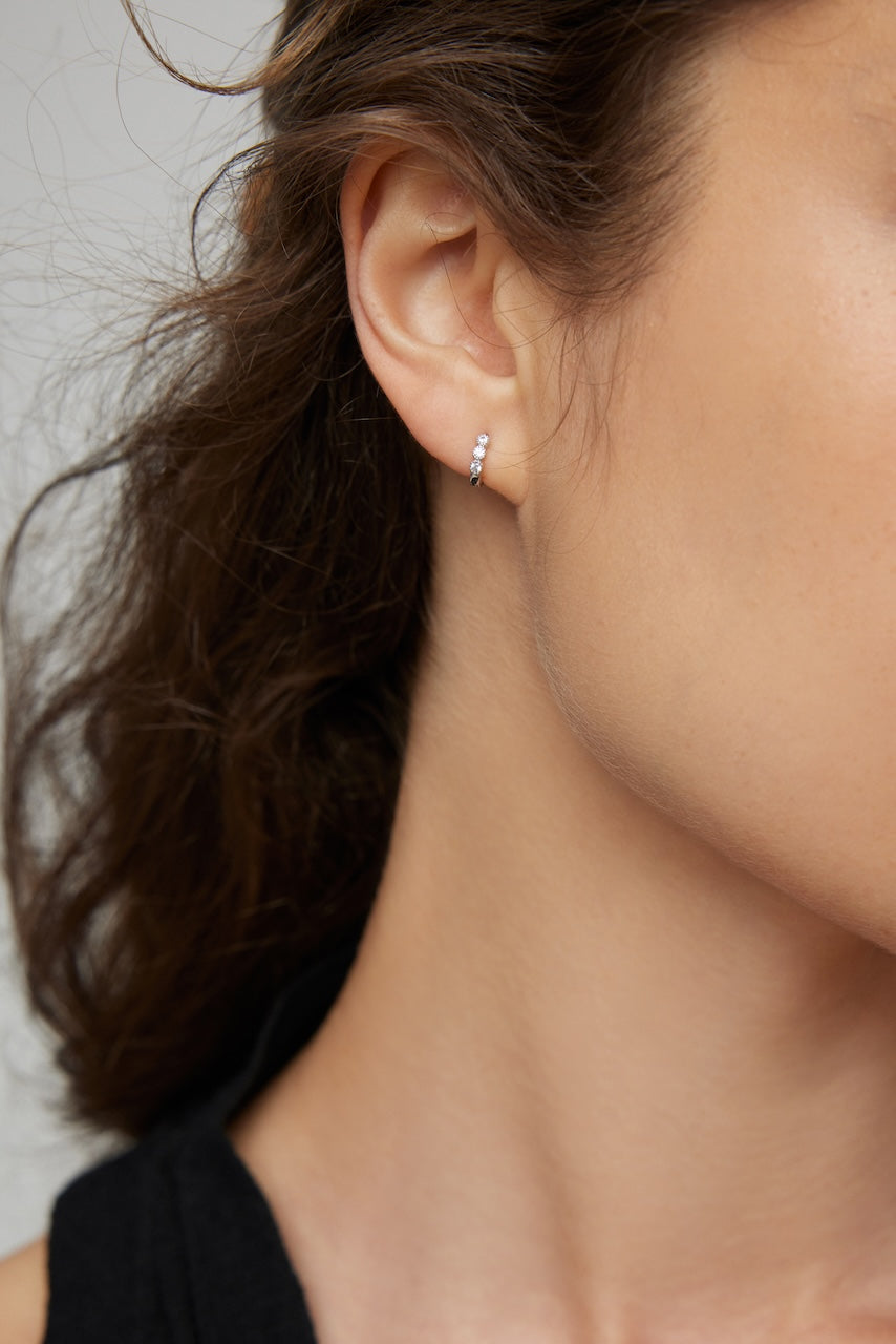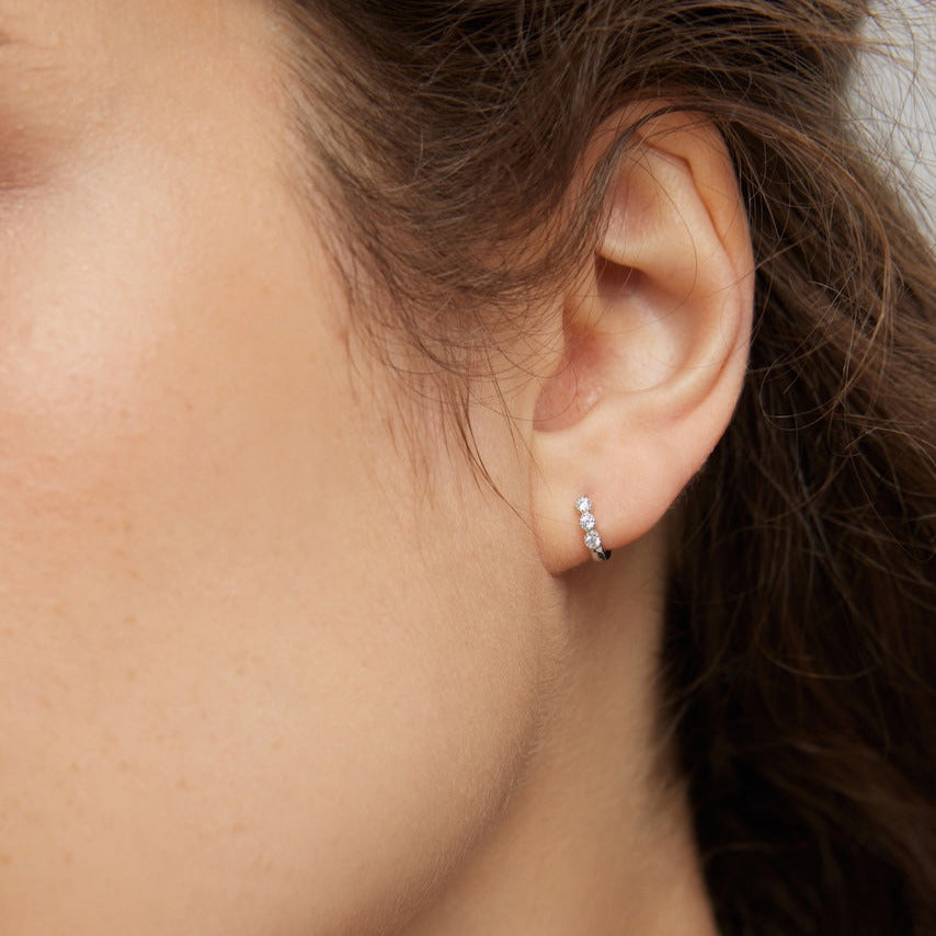 Silver huggie hoop earrings embellished with sparkling stones. Their understated style makes them perfect for everyday wear.